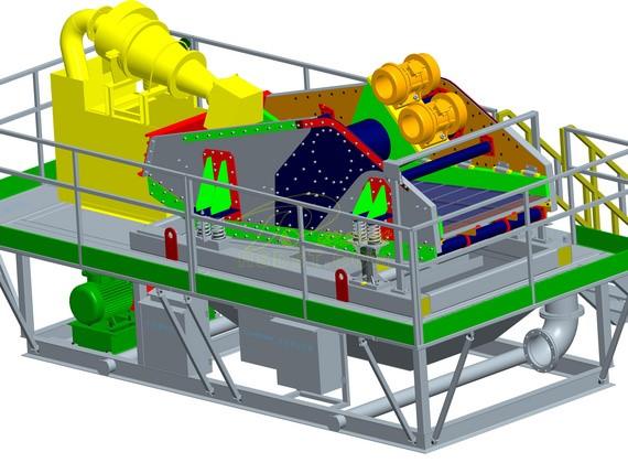 浓缩旋流器与新型脱水筛、渣浆泵组组成的撬装设备,设备具有处理量大、脱水效率高、运行成本低、布置紧凑,安装方便,占用空间小等特点。
